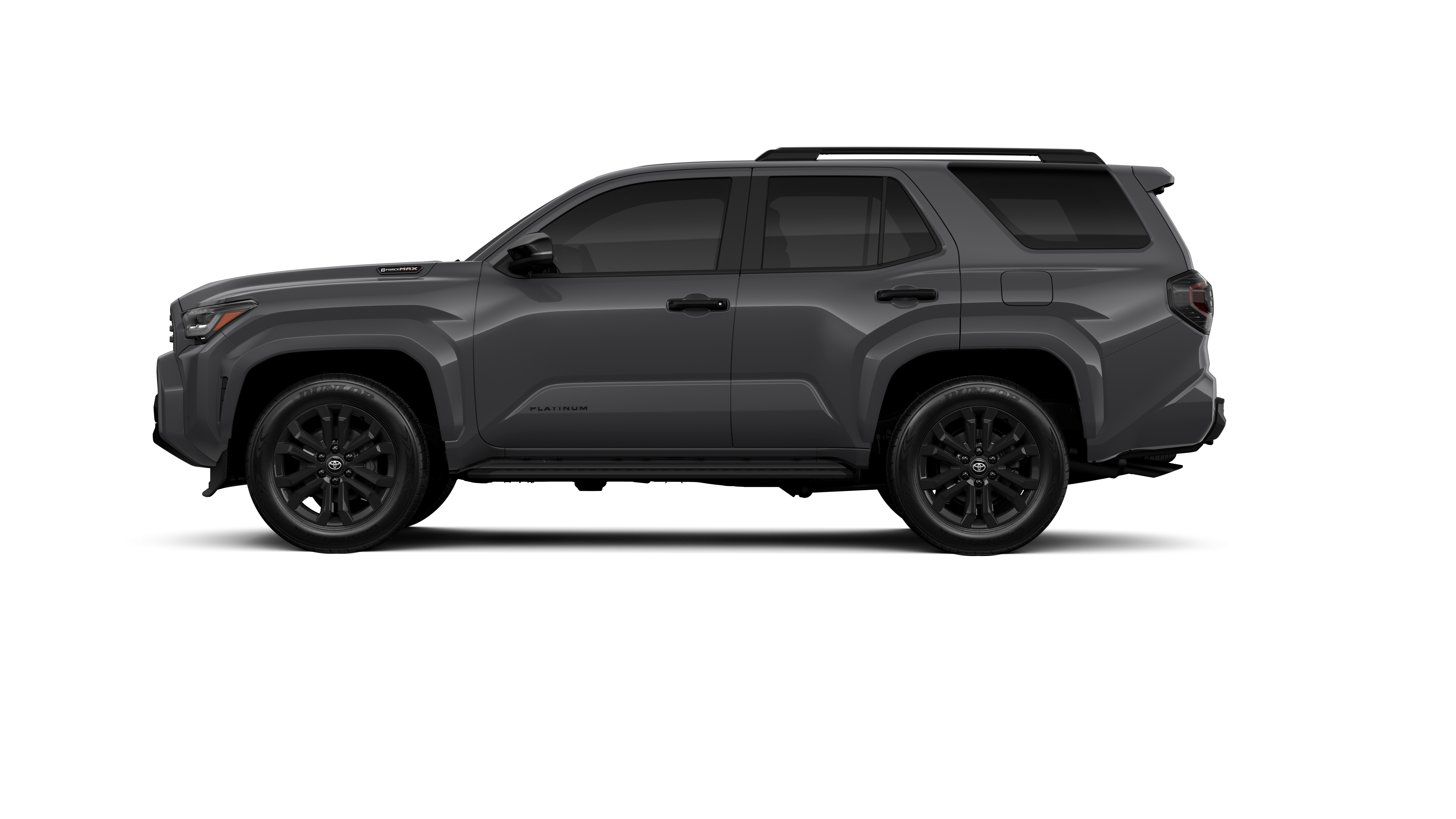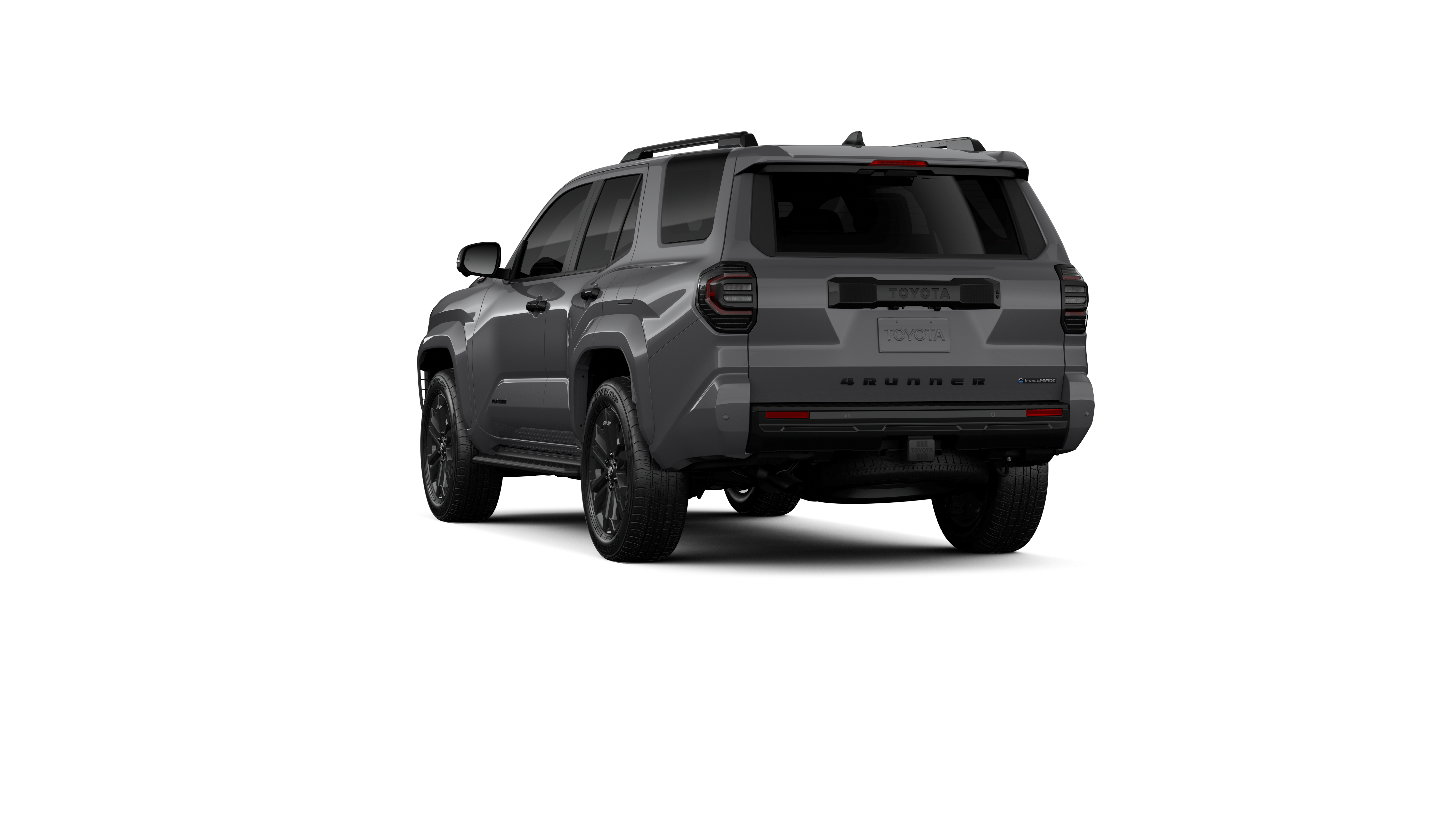 - Dark-chrome tri-bar grille; gloss-black mirror caps and door handles; color-keyed overfenders and rear spoiler; gloss-black "PLATINUM" and "4RUNNER" badges